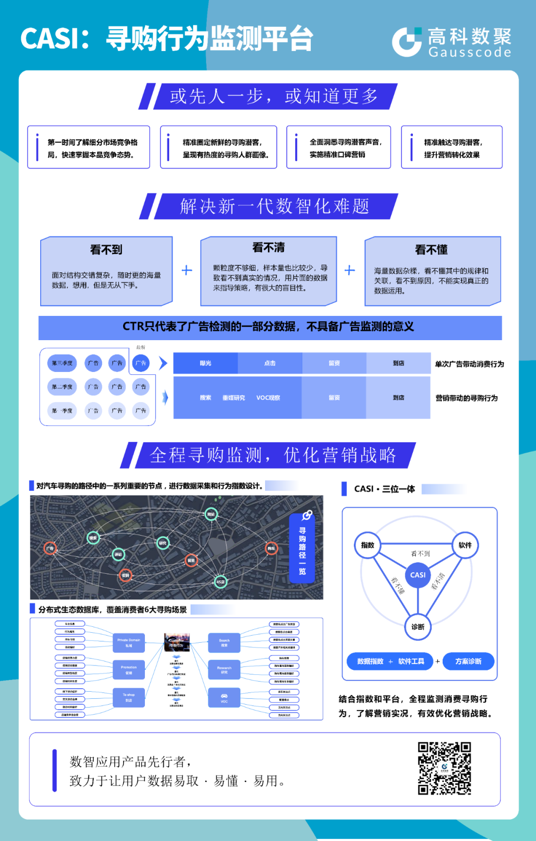 消费者寻购行为监测指数平台CASI,将消费者在寻车、比车、研究、到店、试驾、促销等一系列洞察消费者行为的重要场景和节点进行数据分析指数化,加以高级分析模型及算法,灵活组合各项行为指标,科学、客观的反应综合营销效应,不再依赖单一指标评估营销动作。